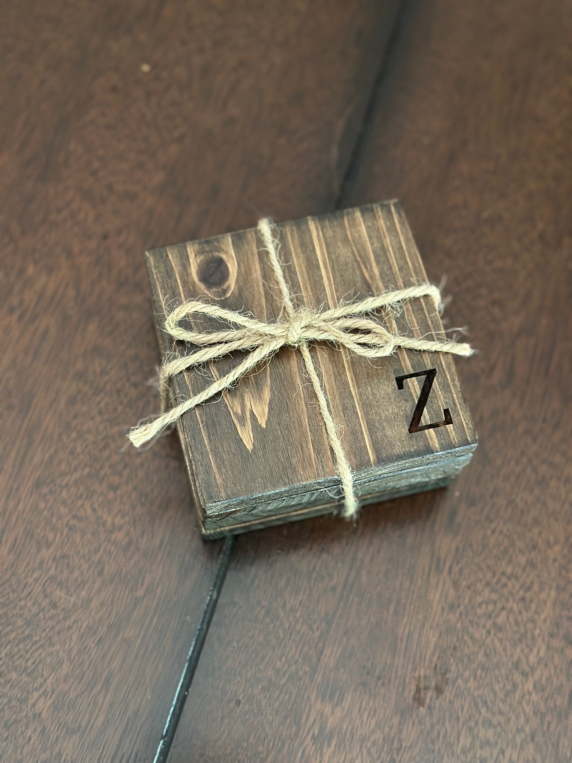 Set of 4 wooden coasters, customized with initial and sealed for moisture protection.